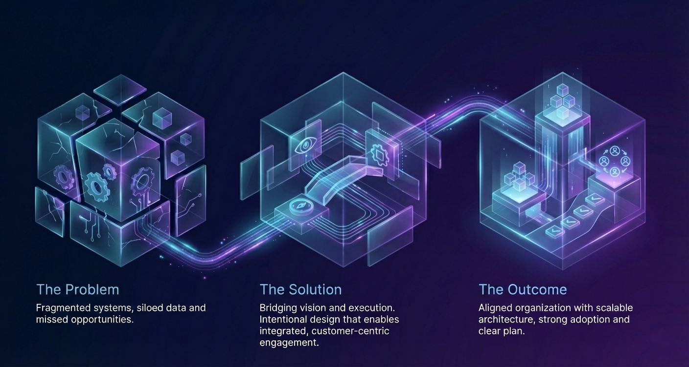 We follow a phased, collaborative methodology designed to bridge vision and execution and help organizations move from fragmented operations to integrated, customer centric engagement.